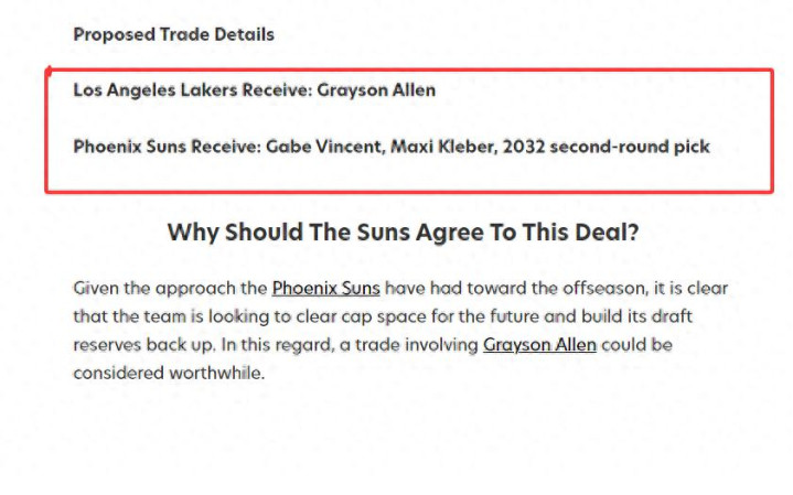因此媒体FW就支招湖人,考虑跟太阳进行交易,可以去追求恶汉格雷森-阿伦。而从具体方案来看,湖人这边送走两替补盖布-文森特和马克西-克勒贝尔,再加上一个2032年的次轮签,同样被当成筹码。