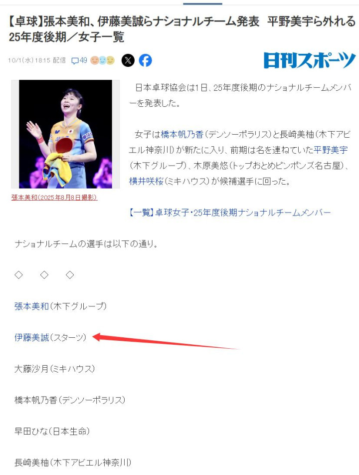 虽然伊藤美诚的状态在走低,但日本乒协并没有放弃他,刚刚公布的2025下半年日乒女队一队的名单:张本美和、伊藤美诚、大藤沙月、桥本帆乃香、早田希娜、长崎美柚。