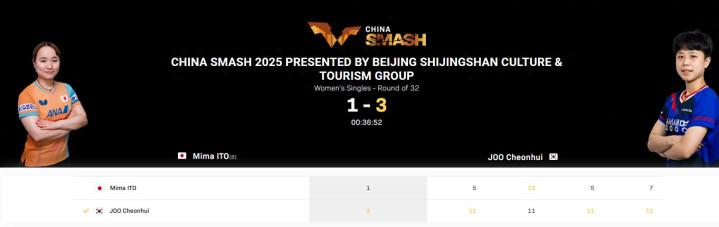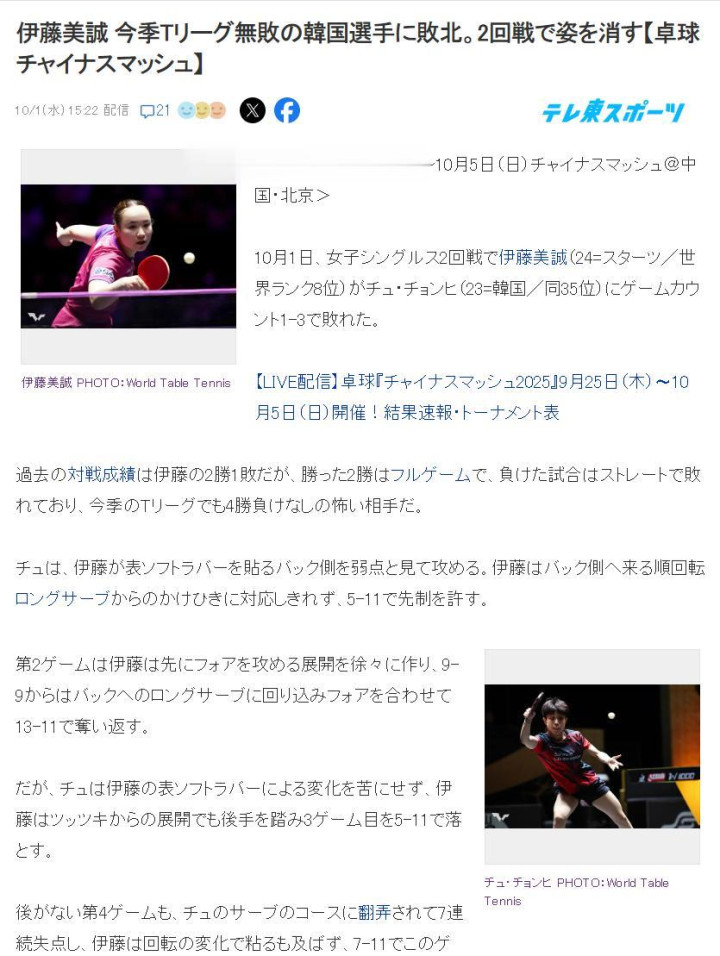 北京时间10月2日,WTT北京大满贯女单1/16决赛,日乒大将伊藤美诚1-3不敌韩乒选手朱芊曦,四局比分:5-11、13-11、5-11、7-11。也就是除了伊藤美诚拿下的第二局,其余的三局伊藤美诚都是惨败,作为世界排名第八日乒女队第二高的选手止步32强的确有些不好看。