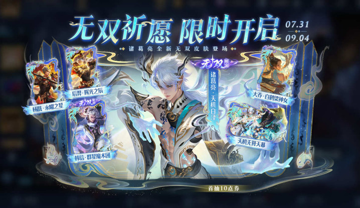 而这一次活动除了可以获得诸葛亮的无双限定皮肤之外,还返场了4款限定皮肤,分别是韩信的无双限定皮肤和后羿杨戬的年限皮肤以及大乔的白鹤梁神女。