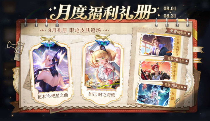 这一次的月度福利限定返场已经确定分别是妲己的时之奇旅和花木兰的燃星之曲。