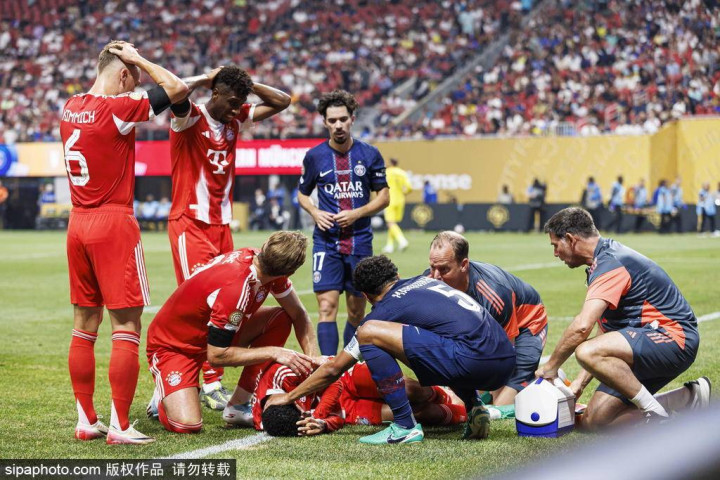 上半场补时阶段,拜仁前锋穆西亚拉与出击的多纳鲁马撞倒在禁区内,穆西亚拉脚踝严重变形,遭遇重伤,随后被担架抬离球场。德国媒体《图片报》表示,穆西亚拉左腓骨骨折,并且有几处韧带受伤,预计伤缺4-5个月。