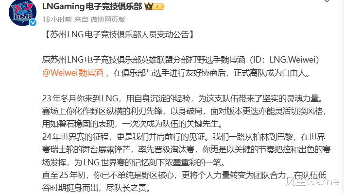 LNG近日发文官宣:Weiwei正式离队,这位打野选手,绝对是LPL最大的薪资“小偷”,S13赛季搭档TheShy和小虎等人,混了个世界亚军,左雾觉得他强,直接给大合同挖过来,结果回到联赛,就原形毕露,第一年还有登场机会,后面两年,直接被下放替补席,雪藏到合同结束才放出来。